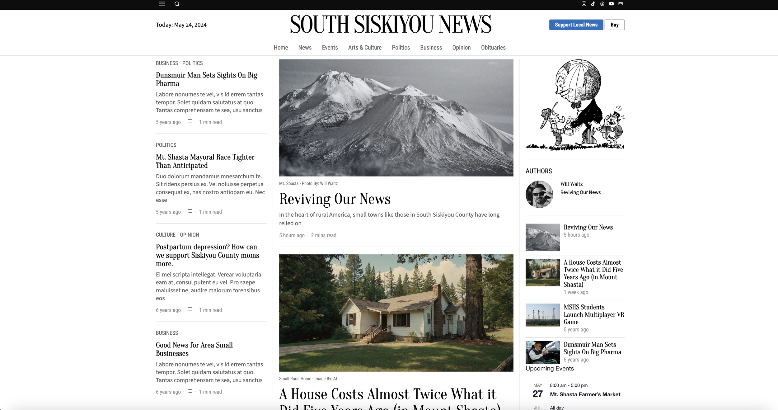Problem: A consolidated national news corporation decimated effective, local, community-focused news for south Siskiyou county after it purchased the Mt. Shasta Herald newspaper. As a result, local residents don’t get the who/what/when/where/why of “local” community news anymore as a result. In addition to the loss of a central source for most of the happenings around the area it has caused a certain degree of social fragmentation in the community.